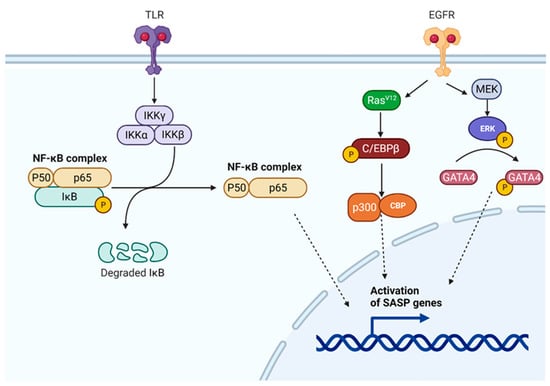 An additional key regulator of SASP is GATA4 (Figure 3), in which activation of ATM and ATR regulates GATA4, and this then stimulates IL-1α production and activates NF-κB [89,98]. Together, these two processes, IL-1α expression and NF-κB activation, have a significant influence on SASP expression via the positive feedback loop [99] and as key SASP-directing transcription factors [89,93].