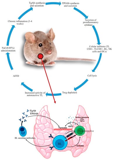 Summary of the mechanisms leading to AITD in the non–obese diabetic (NOD) mice. After the administration of 0.05% NaI in the drinking water, there were findings of chronic inflammation in the following 3–4 weeks. Subsequently, the synthesis of autoantibodies increases (initially against Tg and later against TPO). At the same time, there is an increase in the secretion of proinflammatory cytokines and cell infiltration [mediated initially by TL (CD4+) and then by TL (CD8+), macrophages, and, finally, by BL, although other cells, such as TL, NK, and DCs, among others, also participate in this process]. Additionally, there is an increased production of ADCC, perforin/granzyme, IFN–γ, and TNF–α. TReg depletion increases the severity of the immune response, with loss of immune tolerance and the development of AITD. Abbreviations: ADCC: antibody dependent cell cytotoxicity, BL: B lymphocyte, DCs: dendritic cells, NK: natural killer, Tg: thyroglobulin, TL: T lymphocyte, TPO: thyroid peroxidase, Treg: regulatory T lymphocyte.