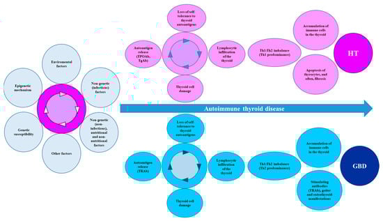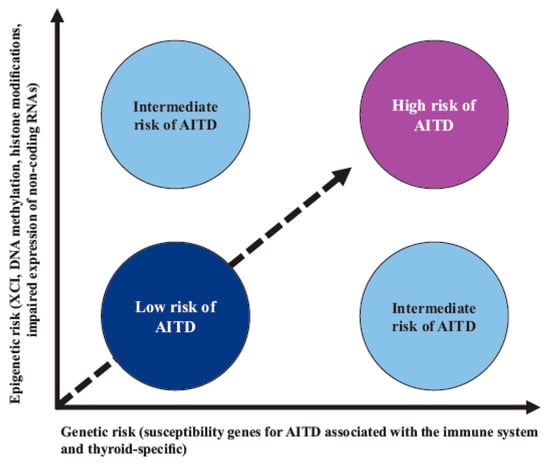 It is generally accepted that AITD is the product of multiple environmental factors that act based on genetic susceptibility, together with some epigenetic mechanisms. However, the molecular mechanism by which immune dysfunction leads to the destruction of thyroid tissue remains largely unexplained [,,,,].
