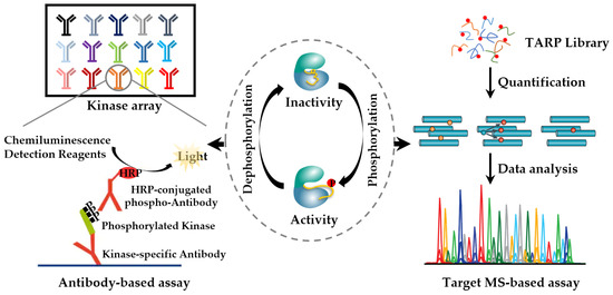 Quantification of kinase activity-representing phosphorylation sites to determine kinome activity. Antibody-based kinase array and target MS-based methods are used for the quantification of phosphorylated kinase.
