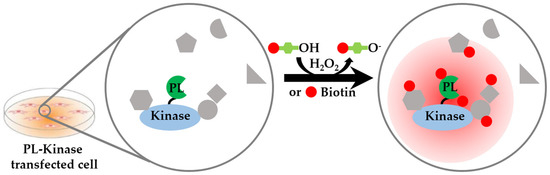 Kinase–substrate interaction analysis based on proximity labeling. PL enzymes are fused to the kinase of interest, which is expressed in the cells. The PL enzymes catalyze biotin-phenol or biotin into reactive biotin, which diffuses and labels proximal proteins.
