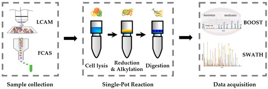 Schematic workflow of the low cell number proteome method. Samples are collected from tissue or cells via LCAM or FACS, then treated in a single pot with three main steps—cell lysis, reduction and alkylation, and digestion. Peptides are detected by the LC-MS/MS with a sensitivity data acquisition mode, such as BOOST and SWATH.