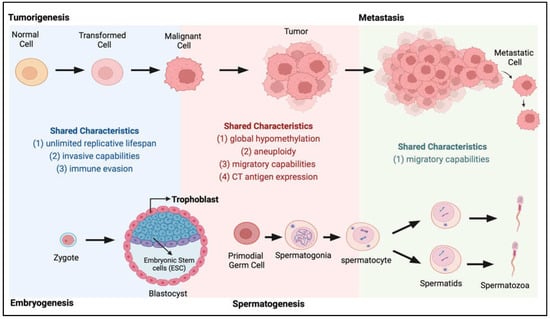 At the beginning of the 20th century, Scottish embryologist John Bread first proposed that cancer arises from migrating germ cells that were “displaced” and never reached the gonads during embryogenesis, a theory now known as the trophoblastic theory of cancer []. Many parallels at the molecular level can be drawn between the processes of embryogenesis, spermatogenesis and cancer progression (Figure 1), supporting this trophoblastic model for tumorigenesis. In the decades following Bread’s proposed theory, data suggesting frequent production of chorionic gonadotropin and other trophoblastic hormones in human cancers [,] further indicates the association between germ cell development and cancer progression. These discoveries galvanised the identification of a growing number of proteins that are exclusively expressed in trophoblasts, germ cells and tumour cells, proteins which we now know as cancer-testis antigens (CTAs) [,]. There is now a theory that the reactivation of the normally silenced gametogenesis programme in somatic cells could be a driving force of tumorigenesis [] and these CTA proteins may play a role in signalling the pathways required for the acquisition of various biological capabilities leading to the cancer phenotype (acquisition of the Hallmarks of Cancer [,,]).