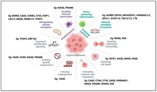 Using the Drosophila melanogaster model, Janic et al. showed that Drosophila CTA genes could drive tumour growth and their suppression was sufficient to curb tumour growth []. To date, several studies have implicated individual CTAs in driving a multitude of cellular pathways leading to the cancer phenotype in human cells, suggesting the diversity of CTA function in human cancers [] and their involvement in conferring or reactivating critical hallmarks of cancer (Figure 2).