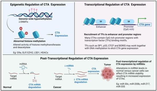 Pictorial summary of our current knowledge on how cancer-testis antigen (CTA) expression is regulated in the context of cancer.