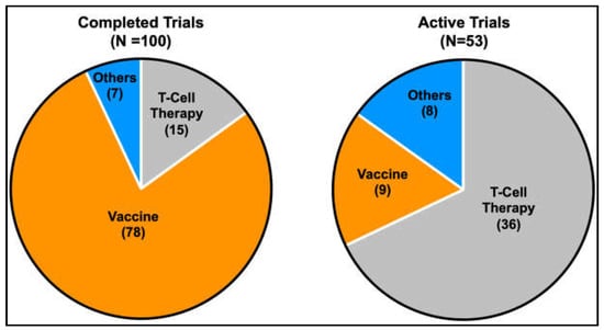 Pie charts indicating the proportion of current therapeutic strategies in completed and active clinical trials targeting CTAs. A gradual shift in the trend from more vaccine-based strategies to T-cell-based strategies is evident from the increase in the proportion of active trials that utilises T-cell-based strategies compared to earlier completed trials.(Information was obtained from https://clinicaltrials.gov, 6 March 2023).