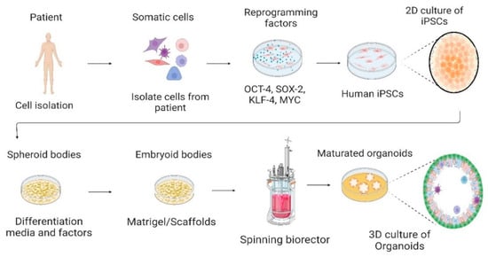 Culture of human-induced pluripotent stem cells in the 2D culture system and differentiation into 3D organoids. Somatic cells are isolated from a human patient, cultured in vitro, and transduced by pluripotency transcription factors, such as OCT-4, SOX-2, KLF-4, and c-MYC. Through reprogramming that induces a pluripotent state in somatic cells, induced pluripotent stem cells (iPSCs) are generated. Cells are cultured and differentiated under specific factors and matrices to generate organoids. Created with BioRender.com, accessed on 23 July 2022.