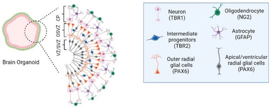 Human cerebral organoids and the timeline of human brain development. (left)—Cellular and cytoarchitectural organization of human cerebral organoids. The human cerebral organoid models can be composed of cell types that are associated with the subventricular zone (SVZ), an outer SVZ (OSVZ), and the cortical plate (CP) of the human brain. SVZ region is constituted by apical radial glia cells and ventricular radial glial cells (PAX6 immunohistochemistry marker), the OSVZ structure by outer radial glial cells (PAX6 immunohistochemistry marker) and intermediate progenitors (TBR2 immunohistochemistry marker). The CP is composed of diverse neuronal subtypes, depending on the CP localization, into deep and upper layers, such as mature neurons (MAP2/TBR1 immunohistochemistry marker), early neurons (TUJ1 immunohistochemistry marker), oligodendrocytes (NG2 immunohistochemistry marker), and astrocytes (GFAP immunohistochemistry marker). Image created with BioRender.com, accessed on 23 July 2022.