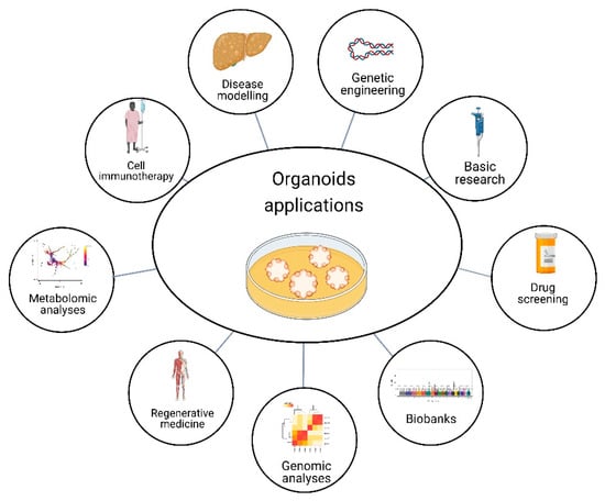 Organoid applications. Organoids have the potential for several purposes, such as basic research, drug screening, genomic and metabolomic analysis, and gene editing to explore disease-linked alleles, called genetic engineering. Moreover, organoids can model diseases, have applications in cell immunotherapy and regenerative medicine, and provide the opportunity to have biobanks. Created with BioRender.com, accessed on 23 July 2022.