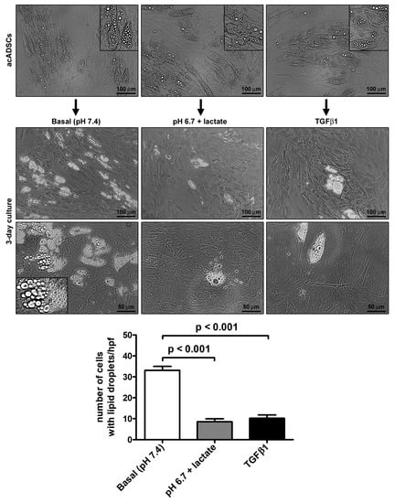 Representative phase-contrast photomicrographs of adipocyte-committed adipose-derived stem cells (acADSCs) cultured under basal conditions (pH 7.4), lactic acidosis (pH 6.7 + lactate), or in the presence of 10 ng/mL TGFβ1 for 3 days. Insets are higher magnification views of the respective panels, displaying prominent intracytoplasmic lipid droplets. Scale bar: 100 µm (upper and middle panels), 50 µm (lower panels). Bars represent the mean ± SEM of the number of cells with intracytoplasmic lipid droplets/high-power field (hpf). Values of p were determined by Tukey’s test.