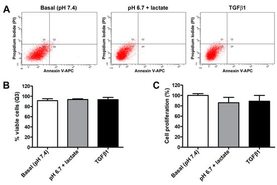 In contrast, we did not observe any significant variation in acADSC viability or proliferation when grown in basal conditions, lactic acidosis, or in the presence of TGFβ1 (Figure 2A–C). Indeed, annexin V/PI assay revealed that the percentage of viable cells at 72 h was approximately 90% in all experimental conditions (Figure 2A,B). Besides viability, cell proliferation evaluated by MTT assay was also not altered, despite a slight but non-significant decreasing tendency observed in acADSCs subjected to lactic acidosis or TGFβ1 treatment (Figure 2C).