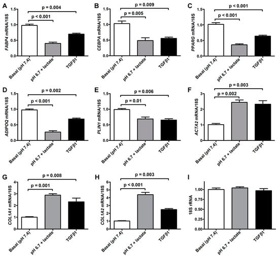 Quantitative real-time PCR analysis for the expression of the adipocytic genes FABP4 (A), CEBPA (B), PPARG (C), ADIPOQ (D), and PLIN1 (E) and the myofibroblastic genes ACTA2 (F), COL1A1 (G), and COL1A2 (H) in adipocyte-committed adipose-derived stem cells grown for 3 days under basal conditions (pH 7.4), lactic acidosis (pH 6.7 + lactate), or in the presence of 10 ng/mL TGFβ1. The basal level of each gene expression was set to 1, and the other results are normalized to this value. 18S ribosomal RNA (rRNA) was used as the reference gene. The expression levels of 18S rRNA were stable under the three different experimental conditions (I). Bars represent the mean ± SEM of three independent experiments (n = 3 replicates each) from three cell lines. Values of p were determined by Tukey’s test.