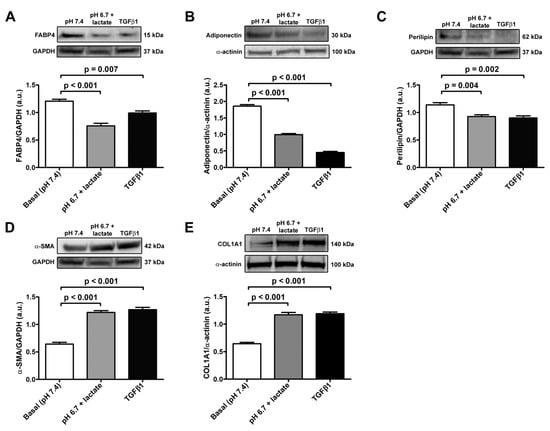 Representative bands of Western blot analysis and the relative quantification charts of the expression of the adipocytic markers FABP4 (A), adiponectin (B), and perilipin-1 (C) and the myofibroblastic markers α-SMA (D) and COL1A1 (E) in adipocyte-committed adipose-derived stem cells grown for 3 days under basal conditions (pH 7.4), lactic acidosis (pH 6.7 + lactate), or in the presence of 10 ng/mL TGFβ1. GAPDH and α-actinin were measured as loading controls for normalization. Molecular weight values (kDa) are indicated. Bars represent the mean ± SEM of optical density in arbitrary units (a.u.). Values of p were determined by Tukey’s test.