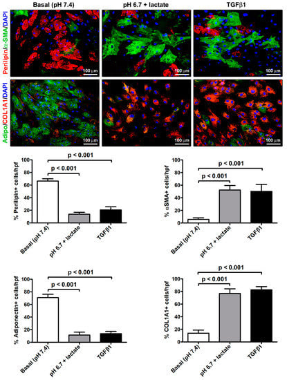Immunofluorescence analysis for the expression of the adipocytic markers perilipin-1 (red, upper panels) and adiponectin (green, lower panels), and the myofibroblastic markers α-SMA (green, upper panels) and COL1A1 (red, lower panels) in adipocyte-committed adipose-derived stem cells grown for 3 days under basal (pH 7.4) conditions, lactic acidosis (pH 6.7 + lactate), or in the presence of 10 ng/mL TGFβ1. Nuclei are stained blue with DAPI. Scale bar: 100 µm. Bars represent the mean ± SEM of the percentage of immunopositive cells/high-power field (hpf). Values of p were determined by Tukey’s test.