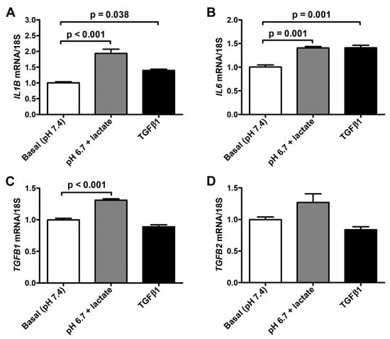 We next observed that the exposure to lactic acidic conditions in vitro induced the acquisition of a pro-inflammatory and pro-fibrotic phenotype by acADSCs. Indeed, acADSCs cultured in a pH 6.7 medium in the presence of 10 mM lactate showed a 1.5-fold increase in mRNA expression of IL1B and IL6 genes (i.e., genes encoding the pro-inflammatory cytokines interleukin (IL)-1β and IL-6, respectively) compared to those maintained under basal (pH 7.4) conditions (Figure 6A,B). The acADSC treatment with 10 ng/mL TGFβ1 was able to stimulate IL1B and IL6 gene expression at a similar level to lactic acidosis (Figure 6A,B). In line with the above-described acADSC switch toward a myofibroblastic-like phenotype under lactic acidosis, we observed that acADSCs exposed to pH 6.7 in the presence of 10 mM lactate showed a modest but significant increase in the mRNA expression of TGFB1 (i.e., gene encoding TGFβ1) compared to acADSCs grown under basal conditions (Figure 6C). A similar trend—even though not significant—was observed for the mRNA expression of TGFB2 (i.e., gene encoding TGFβ2) (Figure 6D).