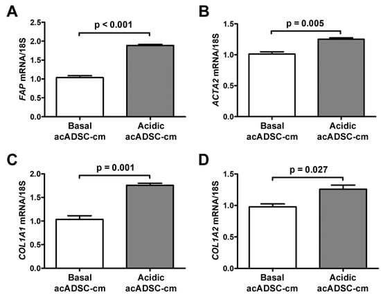 Based on the latter findings, we decided to verify the ability of the acidic acADSCs to promote the reprogramming of naïve stromal cells toward a CAF-like phenotype. At first, we evaluated the effects of the conditioned media collected from acADSCs grown either under basal (pH 7.4) conditions or under lactic acidosis (basal acADSC-cm or acidic acADSC-cm, respectively) on NHDFs. We observed that NHDFs increased the mRNA expression of FAP (i.e., gene encoding fibroblast activation protein), ACTA2, COL1A1, and COL1A2 genes by approximately 1.5 times when treated with acidic acADSC-cm compared to basal acADSC-cm (Figure 7). These data suggest that acADSCs exposed to a lactic acidic microenvironment, following the AMT process, could be responsible for the activation of quiescent fibroblasts toward a CAF-like phenotype, thereby enabling the hypothesis of their possible involvement in the pro-tumor sustainment.