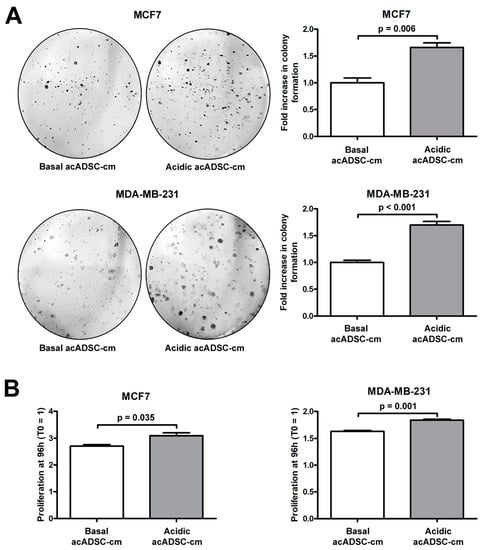 Next, we further investigated the pathogenic effects of acidic acADSC-cm, by focusing the attention at this point on breast cancer cells, particularly on the estrogen receptor (ER)-positive MCF7 and the triple-negative MDA-MB-231 cells. Notably, both MCF7 and MDA-MB-231 cells showed a boosted colony formation ability (Figure 8A) and an increased proliferation (Figure 8B) when exposed to acidic acADSC-cm compared to basal acADSC-cm, suggesting the release of pro-tumoral soluble factors by acidic acADSCs in their conditioned media.