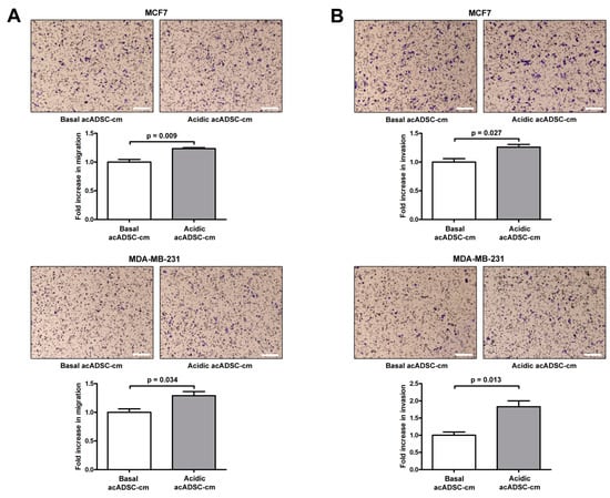 Moreover, both the migratory and invasive abilities of MCF7 and MDA-MB-231 cells were significantly increased following the 24 h treatment with acidic acADSC-cm compared to basal acADSC-cm (Figure 9A,B). More precisely, by treating cancer cells with acidic acADSC-cm, we observed an approximately 1.3-fold increase in the number of MCF7 and MDA-MB-231 cells able to migrate (Figure 9A). In parallel, we detected a 1.3-fold increase in the number of invasive MCF7 cells when treated with the acidic acADSC-cm compared to basal acADSC-cm (Figure 9B). Such an increase was even further evident in the MDA-MB-231 cell line, where the number of invading cells was 1.8 times higher following acidic the acADSC-cm treatment than the basal acADSC-cm (Figure 9B).