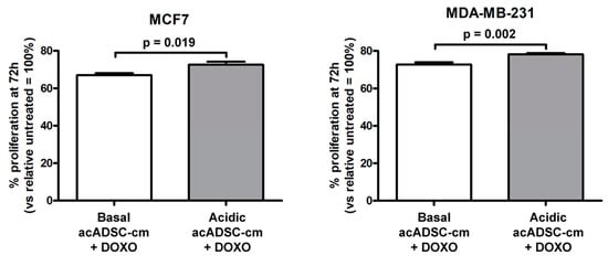 Proliferation charts of MCF7 and MDA-MB-231 cells treated for 72 h, in the presence or absence of doxorubicin (DOXO), with conditioned media from adipocyte-committed adipose-derived stem cells (acADSCs) grown either under basal (pH 7.4) conditions (basal acADSC-cm) or under lactic acidosis (acidic acADSC-cm). Cell proliferation in the absence of DOXO (i.e., untreated) was set to 100%, and the other results are normalized to this value. Bars represent the mean ± SEM of three independent experiments (n = 10 replicates each). Values of p were determined by unpaired Student’s t-test.