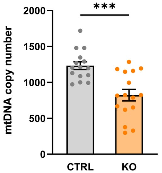 Mitochondria possess their own DNA (mtDNA, 16.5 kb), which codes for 13 mitochondrial proteins, 22 tRNA molecules, and 2 rRNA molecules. Cells contain up to thousands of circular mtDNA molecules, and the amount of mtDNA per cell, i.e., the mtDNA copy number, corresponds to the number of mitochondria (mitochondrial mass) per cell. We found that TSPO−/− cells contained significantly less mtDNA compared to their controls (mtDNA copy number in TSPO−/− 822.1 ± 80.37, control 1232 ± 53.78, p = 0.0003; Welch’s corrected t-test) (Figure 1).
