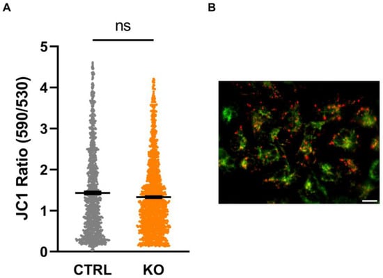 Mitochondrial membrane potential (MMP). The cationic dye JC-1 is attracted by the negative membrane potential of the mitochondria and forms red fluorescing aggregates in highly energized (strongly hyperpolarized MMP) mitochondria. JC-1 aggregates dissociate into green, fluorescent monomers upon reduction (depolarization) of the MMP. Thus, the ratio can be used to estimate the polarity of the MMP. (A) Shown are single values and the mean of n = 3 experiments (CTRL 1.43 ± 0.032 vs. KO 1.33 ± 0.022; n = 3 biological replicates; Mann–Whitney U test). (B) Exemplary image indicating JC-1-loaded mitochondria. Scale bar: 20 µm. ns indicates a non-significant difference.