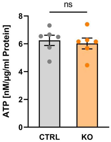 ATP content in human C20 microglia cells. Impact of TSPO deficiency on ATP content. Data are presented as single values as well as mean ± SEM (n = 3) (CTRL 6.246 ± 0.368 vs. KO 6.025 ± 0.389; p = 0.4848, Mann–Whitney U test). ns indicates a non-significant difference.