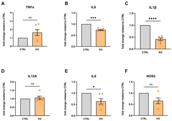 Cytokine mRNA expression in TSPO-deficient human C20 microglia cells normalized to TSPO-expressing control cells (under basal/unstimulated conditions). (A) TNFα: 1.642 ± 0.358, p = 0.1330; (B) IL6: 0.744 ± 0.025, p = 0.0002; (C) IL1β: 0.409 ± 0.053, p < 0.0001; (D) IL12A: 1.062 ± 0.094, p = 0.5404; (E) IL8: 0.634 ± 0.119, p = 0.283; and (F) NOS2: 0.655 ± 0.130, p = 0.0571. N = 6, Welch’s corrected t-test. Stars indicate significance. ns indicates a non-significant difference.