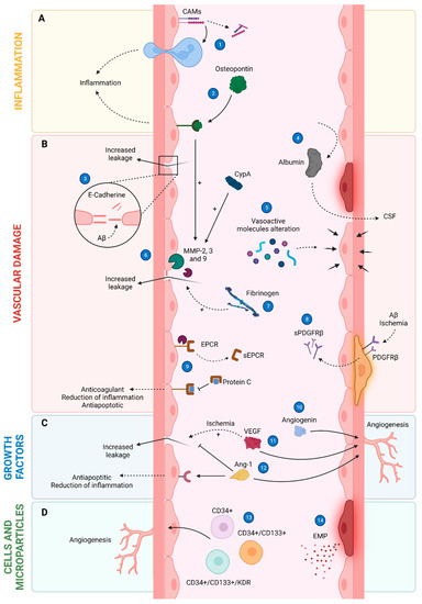 Several cellular pathways underlying endothelial dysfunction. (A) Inflammation: CAMs are released from the endothelial membrane in their soluble form, and this process is involved in immune cell extravasation causing vascular dysfunction and inflammation (1). OPN acting through its receptor causes brain inflammation (2). (B) Vascular damage: Aβ induces the release of the extracellular domain of VE-cadherin, increasing leakage due to vascular damage (3). The presence of albumin in both the CSF and the brain means BBB damage as it is a protein only synthesized in the liver, thus, implying diffusion from the blood to the brain tissue (4). The action of several vasoactive molecules may cause either vasoconstriction or vasodilatation during AD (5). Several MMPs provoke BBB leakage by inducing the cleavage of tight junction proteins and basal lamina components (6), as well as high levels of fibrinogen (7). Under ischemic conditions or the presence of the Aβ peptide, there is a release of the soluble fragment of the PDGFRβ from pericytes, indicating damage (8). The soluble EPCR competes with the cellular EPCR for protein C binding, having an indirect pro-apoptotic, pro-coagulant, and pro-inflammatory function (9). (C) Growth factors: angiogenin (10), VEGF (11), and Ang-1 (12) promote angiogenesis; besides, VEGF can promote BBB leakage in the brain under ischemic conditions, an event that can be diminished by Ang-1. (D) Cells and microparticles: CPCs (CD34+) are a group of cells involved in tissue maintenance and repair, including HPCs (CD34+/CD133+) and EPCs (CD34+/CD133+/KDR), that are associated with vascular repair (13). Elevated amounts of endothelial-derived EMPs usually indicate endothelial injury (14).