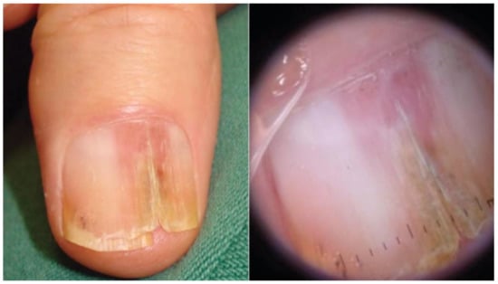 - Lipner, S.R.; Scher, R.K. Evaluation of nail lines: Color and shape hold clues. Cleve Clin. J. Med. 2016, 83, 385–391. [Google Scholar] [CrossRef] [PubMed]
