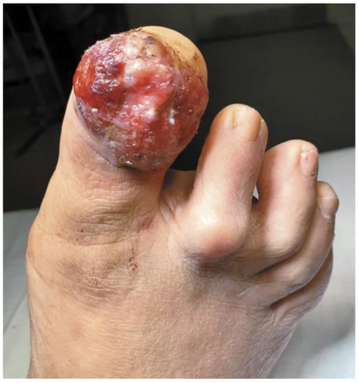 - Black, A.T.; Lahouti, A.H.; Genco, I.S.; Yagudayev, M.; Markinson, B.C.; Spielfogel, W.D. A Rare Case of Osteoinvasive Amelanotic Melanoma of the Nail Unit. Ski. Appendage Disord. 2021, 7, 139–143. [Google Scholar] [CrossRef]