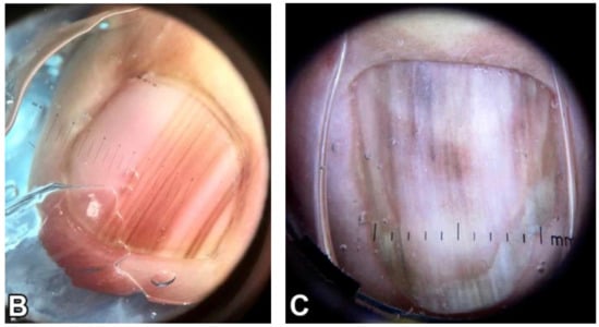 Dermoscopic appearance of subungual melanomas. (B), Brown lines on a brown background, irregular color, thickness, and spacing with no loss of parallelism. (C), Brown lines on a brown background, irregular color, thickness, and spacing with loss of parallelism. Reproduced with permission from ref. [].