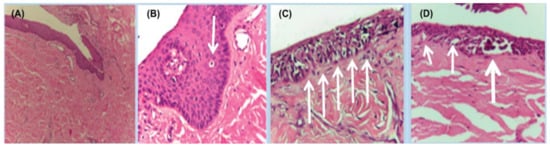 Histopathology of in situ matrix melanomas. Hematoxylin and eosin stain. (A), Almost invisible changes. (B), A few cells are obvious (arrow). (C), The entire matrix epithelium shows pagetoid spread of atypical melanocytes (arrows). (D), Lentiginous (small arrows) and nest-like (large arrow) proliferation of atypical melanocytes. Reproduced with permission from ref. [].