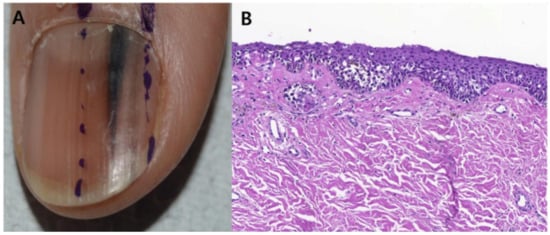 - Cooper, C.; Arva, N.C.; Lee, C.; Yélamos, O.; Obregon, R.; Sholl, L.M.; Wagner, A.; Shen, L.; Guitart, J.; Gerami, P. A clinical, histopathologic, and outcome study of melanonychia striata in childhood. J. Am. Acad. Dermatol. 2015, 72, 773–779. [Google Scholar] [CrossRef] [PubMed]