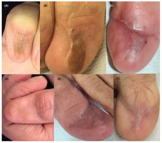 Nail unit melanoma after surgical outcome—good aesthetic and functional outcome. (A,B,D,E) defects required full-thickness skin graft for closure. (C,F), were allowed to heal secondarily. Reproduced with permission from ref. [].