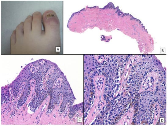 Subungual melanoma in situ (subungual lentiginous melanocytic proliferation with atypia). (A), A 13-year-old girl was referred to complete treatment of a lesion diagnosed as subungual melanoma in situ. The clinical examination revealed the nail bed to show no signs of persistence of the tumor after complete excision of the nail unit. (B), Panoramic view of a transverse biopsy of the matrix showing subepidermal fissures and intraepithelial cell proliferation. (C), Greater detail (×200) shows a lentiginous proliferation of atypical melanocytes, with the formation of fissures between the epithelium and underlying dermis and the focal suprabasal ascent of melanocytes, which completely replaces the keratinocytes in the basal layer. (D), High magnification (×400) reveals the atypical cellular characteristics of the proliferation: large melanocytes with pyknotic and pleomorphic nuclei and suprabasal ascent in some areas. Reproduced with permission from ref. [].