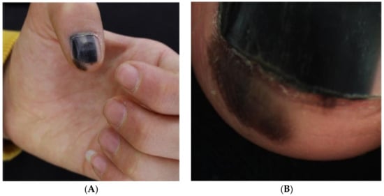 - Ruben, B.S. Pigmented lesions of the nail unit: Clinical and histopathologic features. Semin. Cutan. Med. Surg. 2010, 29, 148–158. [Google Scholar] [CrossRef]