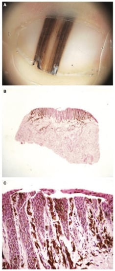 - Duarte, A.F.; Correia, O.; Barros, A.M.; Ventura, F.; Haneke, E. Nail melanoma in situ: Clinical, dermoscopic, pathologic clues, and steps for minimally invasive treatment. Dermatol. Surg. 2015, 41, 59–68. [Google Scholar] [CrossRef]