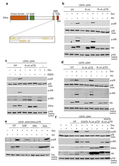 We set out to investigate if these motifs are of functional importance for the ability of the S domain to sense ribotoxic stress insults. To this end, we rescued previously established Zak KO U2OS (U2OS ΔZAK) cells with doxycycline-inducible versions of ectopic STREP-HA-tagged ZAKα, where all arginines and lysines in these motifs were replaced with alanines, either in a full-length context or with a deletion of the last 27 amino acids of the CTD (R -> A, R -> A ΔCTD) (Figure S1a). Mutation of the S domain in isolation (R -> A) did not abrogate anisomycin-induced activation of ZAKα, as visualized by the phosphorylation of the two downstream kinases p38 and JNK (Figure 1b). However, when combined with CTD deletion, which on its own does not preclude ZAKα activation [20], this response was completely absent (Figure 1b). This double mutant was also defective for the characteristic anisomycin-induced gel mobility shift (Figure 1b), which is indicative of ZAKα autophosphorylation [20]. We recently showed that cells incubated in the starvation medium Earle’s Balanced Salt Solution (EBSS) also activate p38 and JNK in a ZAKα-dependent fashion [18]. Similar to the anisomycin treatment above, this response was also dependent on the integrity of the S domain peptide motifs within ZAKα (Figure 1c). As a control for starvation-associated mTOR inhibition, we probed the phosphorylation state of S6 kinase (p-S6K) [25]. The arginines within the RGRYXXR/K motifs are subject to methylation [26] (phosphosite.org (accessed on 16 March 2023)). In order to investigate whether the positive charge of these residues or their modification is more relevant, we also constructed a CTD-deleted version of ZAKα where we changed all the relevant arginines to lysines (R -> K ΔCTD) (Figure S1a). This mutant perfectly rescued U2OS ΔZAK cells (Figure 1d), suggesting that arginine methylation within these motifs is not required for ZAKα activation. We also generated an alanine substitution construct where only a single of the three motifs retained their arginine residues (AAR, ARA and RAA, Figure S1a). Two of these (AAR and ARA) displayed low protein stability and/or were inefficiently expressed, resulting in the poor rescue of U2OS ΔZAK cells (Figure 1e). However, the RAA ΔCTD mutant perfectly rescued ZAK deficiency (Figure 1e), indicating that only a single intact RGRYXXR/K motif is sufficient to confer full functionality on the S domain. Our results highlight a repetitive peptide motif in ZAKα that is critical for the ribotoxic stress-sensing function of the S domain.