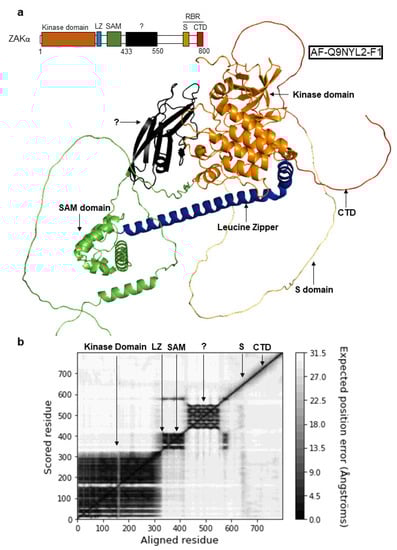JSON PAE files of the predicted ZAKα structure are available from the AlphaFold database: https://alphafold.ebi.ac.uk/ (accessed on 16 March 2023). Code is available at https://github.com/Valdemar-BI-Johansen/MAP3K20_PAE.git (accessed on 16 March 2023), and the array, which Figure 2b is based on, is also available in Table S2. The full results from our DALI analysis, including 1293 proteins, are available in an excel format as Supplementary Information in Table S1. The DALI method is accessible as a web service at http://ekhidna.biocenter.helsinki.fi/dali (accessed on 16 March 2023). The standalone version can be downloaded from http://ekhidna.biocenter.helsinki.fi/dali/#download (accessed on 16 March 2023).