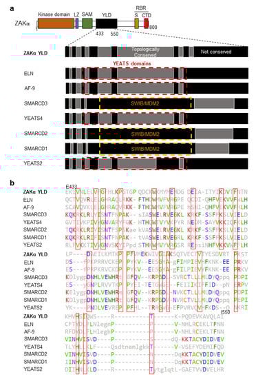 We next investigated the regional, topological similarities between amino acids 433–550 of ZAKα and the DALI hits in Figure 3c–i. Strikingly, this putative domain within ZAKα shared high topology with the YEATS domains of ELN, AF-9, YEATS4, and YEATS2, suggesting a YEATS-Like Domain (YLD) within ZAKα (Figure 4a).