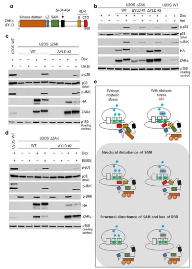 Disruption of the YLD decreases the activation potential of ZAKα. (a) Schematic of the ZAKα ΔYLD mutant protein, indicating a deleted region within the YLD domain. (b) U2OS ΔZAK cells were rescued with either wildtype (WT) ZAKα or ZAKα YLD, of which two clones with different expression levels were analyzed (ΔYLD #1 and #2). Cells were induced for expression with doxycycline (Dox) and treated with anisomycin (Ani—10 μg/mL, 1 h). Lysates were analyzed by immunoblotting with the indicated antibodies. (c) Cells from (b) were irradiated with UV-B (500 J/m2—1 h) and analyzed as in (b). (d) Cells from (b) were incubated in EBSS medium (18 h) and analyzed as in (b). (e) Model of ZAKα activation by ribosome impairment, here caused by binding of anisomycin (ANI) to the peptidyl transferase center. The SAM domain inhibits activation whereas the kinase scans ribosomes (top panel—left). This inhibition is relieved upon recognition of ribotoxic stress signals by the C-terminal S and CTD domains (top panel—right). Kinase activation is signified by ZAKα autophosphorylation (P). Upon mutation of the SAM domain, sensing of ribotoxic stress by the RBR region (S + CTD) is not required for ZAKα activation (middle and bottom panels). ZAKα domains are color-coded as in (a). LZ, Leucine Zipper; SAM, Sterile Alpha Motif; YLD, YEATS-Like Domain; S, Sensor Domain; CTD, C-Terminal Domain; RBR, Ribosome Binding Region; and p-, phosphorylated (activated) form of kinase.