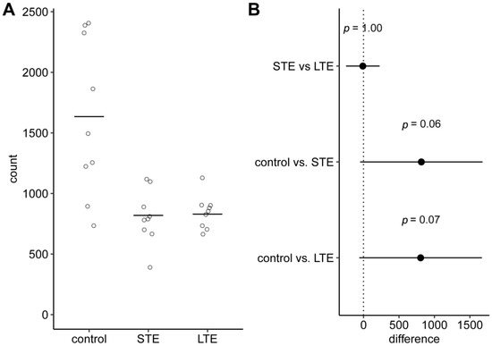Effect of blue light exposure on number of melanopsin positive intrinsically photosensitive retinal ganglion cells (ipRGCs) in whole-mount retinas from Wistar rats. The rats were exposed to 12 h white light (150 lx) and 12 h darkness for 10 d (control, CTRL; 9 rats), cycles of 12 h blue light (150 lx) and 12 h darkness for 10 d (long-term exposure, LTE; 9 rats), and constant blue light (150 lx) for 2 d (short-term exposure, STE; 9 rats). (A) Circles show number of melanopsin positive ipRGCs in a whole-mount retina from one rat. Horizontal lines show 20%-trimmed mean. (B) Dot shows difference between group means. Error bar shows 95% confidence interval for the difference. p-values and confidence intervals were calculated with Wilcox’s robust technique based on trimmed means [34,35].
