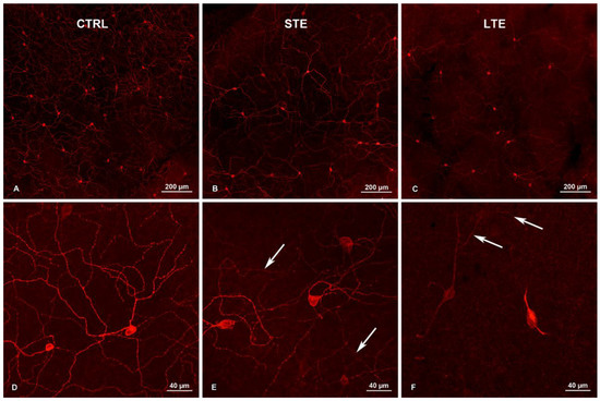 The intensity of staining in the somas and dendrites was less intense in the LTE group than in the control group (Figure 2D–F). The reduction of Opn4-immunoreactivity was visible mostly in the outer stratifying dendrites (Figure 2F). In some neurons in the STE group, the staining was also less intense than in the control group. In all three groups, Opn4-positive varicosities were visible on the dendrites, but in the LTE group, they were less prominent and less frequent (Figure 2D–F). In most dendrites in the LTE group, the staining did not extend as far from the soma as it did in the other groups (Figure 2F).