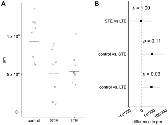The mean length of Opn4-positive ipRGC dendrites was 1.7-fold shorter in the LTE group than in the control group, and this difference was statistically significant (Figure 3). The mean length of these dendrites was 1.8-fold lower in the STE group than in the control group. However, even though this difference was larger than the difference between the LTE group and the control group, it was not statistically significant because the variation between individuals was greater in the STE group than the LTE group. The 95% confidence intervals (CIs) for both comparisons with the control group extended from close-to-zero difference to differences of over 75,000 µm.