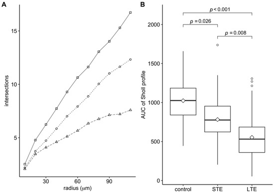 Effect of blue light exposure on dendritic arborization of intrinsically photosensitive retinal ganglion cells (ipRGCs). The rats were exposed to 12 h white light (150 lx) and 12 h darkness for 10 d (control, 9 rats), cycles of 12 h blue light (150 lx) and 12 h darkness for 10 d (long-term exposure, LTE; 9 rats), and constant blue light (150 lx) for 2 d (short-term exposure, STE; 9 rats). (A) Sholl profiles: squares, circles, and triangles (control, STE, and LTE groups, respectively) show mean number of melanopsin-positive dendrites intersecting each radius around the ipRGC somas. (B) Area under the curve (AUC) of each Sholl profile shown in Figure 4A. The boxes show the central 50% of the data, diamonds show the mean AUC, thick horizontal lines show the median, vertical lines outside the box extend to the furthest non-outlying data points, and circles show outliers. p-values were calculated using a mixed model followed by Tukey’s method for pairwise comparisons.