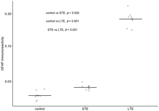 Effect of blue light on the intensity of glial fibrillary acid (GFAP) protein immunoreactivity relative to intensity of DAPI staining in Wistar rat retinas. The rats were exposed to 12 h white light (150 lx) and 12 h darkness for 10 d (control; 9 rats), cycles of 12 h blue light (150 lx) and 12 h darkness for 10 d (long-term exposure, LTE; 9 rats), and constant blue light (150 lx) for 2 d (short-term exposure, STE; 9 rats). Note the logarithmic scale on the vertical axis. Circles show the intensity of GFAP immunoreactivity in one retinal cryosection; horizontal lines show 20%-trimmed means in each group. p-values were calculated with Wilcox’s robust method based on 20%-trimmed means [34,35].