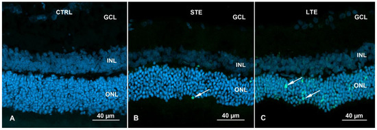Signs of retinal damage were seen in the LTE and STE groups but not in the control group (Figure 5). In the LTE group, chromatin condensation and apoptotic bodies were seen in the ONL (Figure 5C). In the retinas of the STE group, similar signs of apoptosis were occasionally seen in the ONL. In the STE samples, the inner photoreceptor segments appeared normal but were sparser than in the control-group samples (Figure 5B). In the LTE group, those segments were shorter and smaller than in the control group (Figure 5C). Loss of the photoreceptor outer segments was clearly visible in the LTE and STE groups. In the LTE and STE groups, the outer segments were vesiculated (Figure 5B,C). Finally, the ONL appeared to be thinner in the LTE group than in the control group.