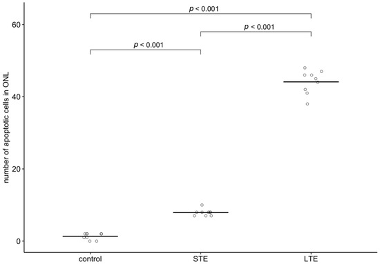 In the STE and control groups, although empty spaces were occasionally present between cells, the ONL appeared normal (Figure 10A,D). However, in the LTE group, signs of apoptosis in the ONL (pyknosis and condensation of the cytoplasm) were occasionally seen (Figure 10G). In this group, cells displaying signs of apoptosis were scattered throughout the ONL and were observed in the outer and inner regions of this layer. In the LTE group, thick processes with intermediate filaments (likely from Müller cells) were observed around cells in the ONL (Supplementary Figure S2), but these processes were not observed in the STE and control groups.