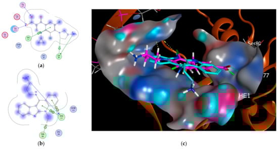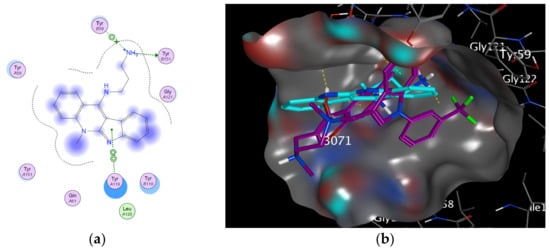Regarding topoisomerase II, the proposed binding mode of APAN showed an affinity value of −5.5996. It showed one hydrogen bond interaction in addition to pi interactions, and the planer aromatic system of substituted neocryptolepine showed aromatic stacking interactions, while the terminal aminopropylamino moiety was directed at the DNA-minor groove (Figure 4). Docking results including residues involved in the interactions as well as the types of bonding are tabulated in Table 1.