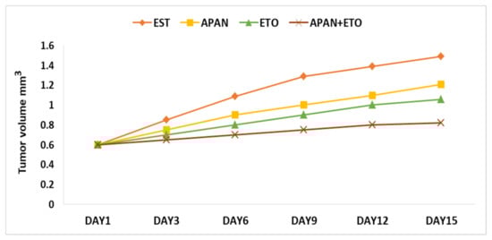 The effect of the treatment of solid tumor implanted in mice with APAN or/and ETO on the progress and proliferation of subcutaneously injected EST was evaluated by their growth-dependent variation at tumor weight and volume in different groups after 14 days of EST injection. Table 2 demonstrated a significant reduction (p < 0.01) in tumor weight and volume in different treatment groups (EST+APAN, EST+ETO, and EST+APAN+ETO) compared with the EST-non-treated group at the end of the experiment. The maximum decrease ratio was seen in the dual treatment group compared with EST and mono treatment groups. Figure 5 showed a graph representing changes in tumor size vs. days over the course of mono and dual treatment.